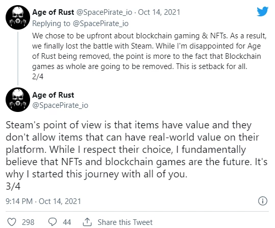 «Мы решили быть откровенными в отношении игр с блокчейном и NFT. В результате мы наконец проиграли битву со Steam. Хотя я разочарован удалением Age of Rust, дело скорее в том, что игры Blockchain все будут удалены. Это неудача для всех ».