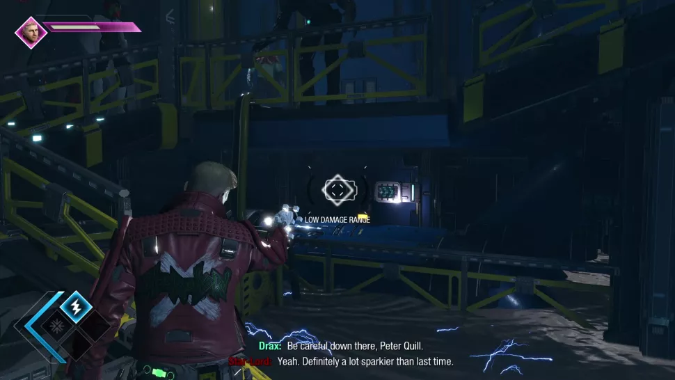 Когда вы вернетесь в Главу 7, ваши руки будут развязаны, и с вами будут остальные Стражи Галактики. Однако на лестнице произошла утечка, и нижний уровень погружен в воду по щиколотку, через которую проходит электрический заряд. Чтобы преодолеть волну воды и получить костюм, сделайте следующее:
