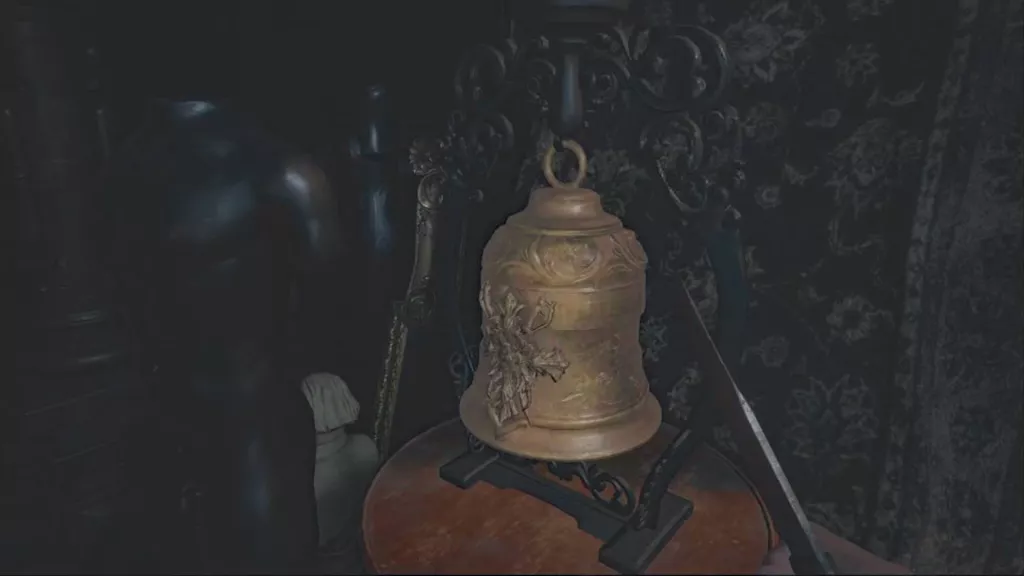 - Слева от портрета Димитреску расположен самый простой колокол. Он стоит на столе. Между статуей и бюстом.