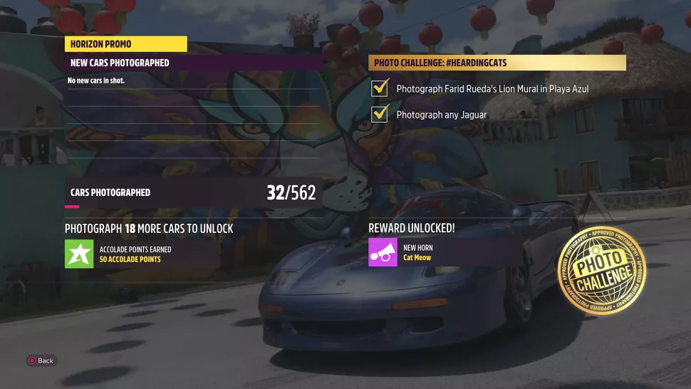 Как только вы найдете фреску, вам нужно будет припарковать свой автомобиль Jaguar перед ней и войти в режим фото, что делается нажатием на D-Pad на контроллере Xbox. Убедитесь, что ваша машина и фреска четко видны в фоторамке, но не беспокойтесь о том, чтобы она выглядела красиво, если только вы не хотите по-настоящему проявить свои навыки фотографирования в игре. Нажмите RB, чтобы сделать быстрое рекламное фото, вы увидите, выполнили ли вы требования фотовызова Herding Cats на экране промо-акции Horizon. Вы получите золотую печать и рожок Кошка Мяу для своей машины, если вы сделаете правильное фото.