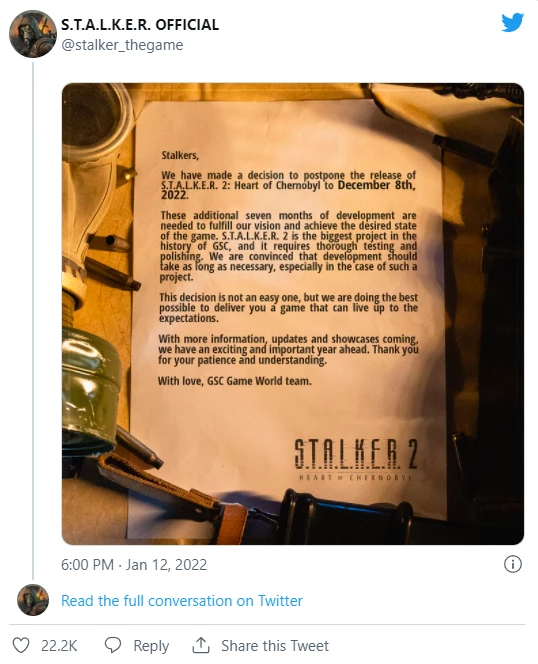Сталкер 2 был отложен примерно на 7 месяцев, с 28 апреля по 8 декабря 2022 года.