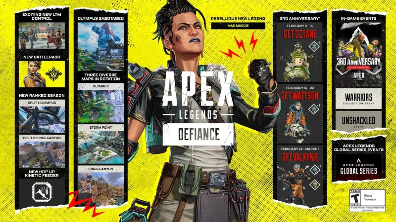 Отпразднуйте 3-ю годовщину Apex Legends с Defiance, совершенно новым сезоном, который представляет совершенно новый ограниченный по времени режим 9 на 9 с Control, легендой, наполненной панк-роком с Безумной Мэгги, первым обновлением карты для Olympus, захватывающим новым Боевой пропуск, новый рейтинговый сезон и многое другое.