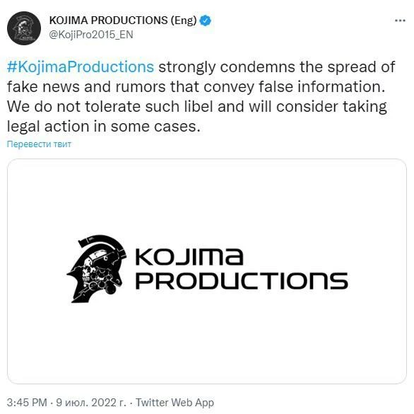 «Kojima Productions решительно осуждает распространение фейковых новостей и слухов, содержащих заведомо ложную информацию. Мы не приемлем клевету и в некоторых случаях рассмотрим возможность обращения в суд»