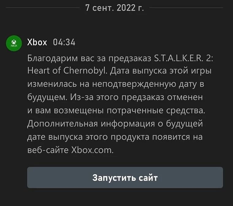 «Благодарим вас за предзаказ S.T.A.L.K.E.R. 2: Heart of Chernobyl. Дата выпуска этой игры изменилась на неподтвержденную дату в будущем. Из-за этого предзаказ отменен и вам возмещены потраченные средства. Дополнительная информация о дате выпуска этого продукта появится на веб-сайте Xbox.com»