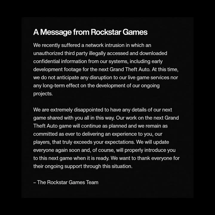 Также было обещано вскоре поделиться «обновлением», хотя не уточнялось, будет ли оно касаться только GTA 6, или всей утечки и ее возможных последствий для компании. Они могут оказаться более серьезными, чем следует из твита Rockstar Games (по крайней мере, если судить по сообщениям о настроении сотрудников компании).