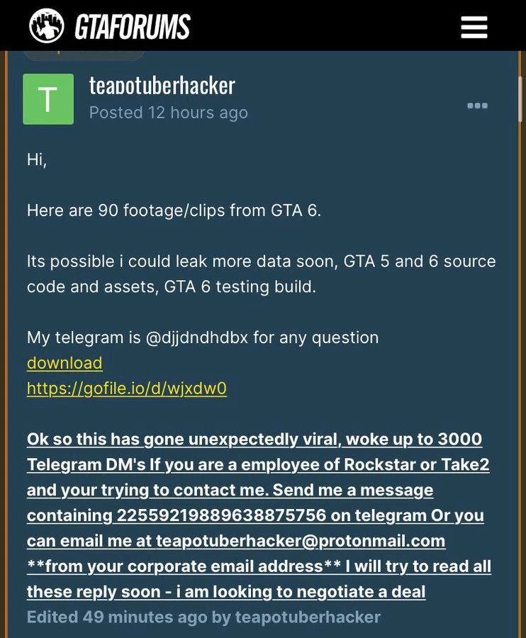 Хакер заявил, что у него имеется исходный код GTA VI и тестовая сборка игры + исходный код GTA V. И если с ним не свяжутся и не обговорят условия данного «выкупа», то он выложит все в открытый доступ.
