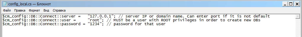 - В папке с сервером заходим в папку docs и редактируем config_local.cs (e://Test/serverlif/docs). Можно открыть с помощью блокнота.