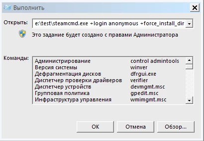 - Нажимаем сочетание клавиш Win+R, где вводим путь к файлу e:\Test\steamcmd.exe и, через пробел, добавляем следующие команды: