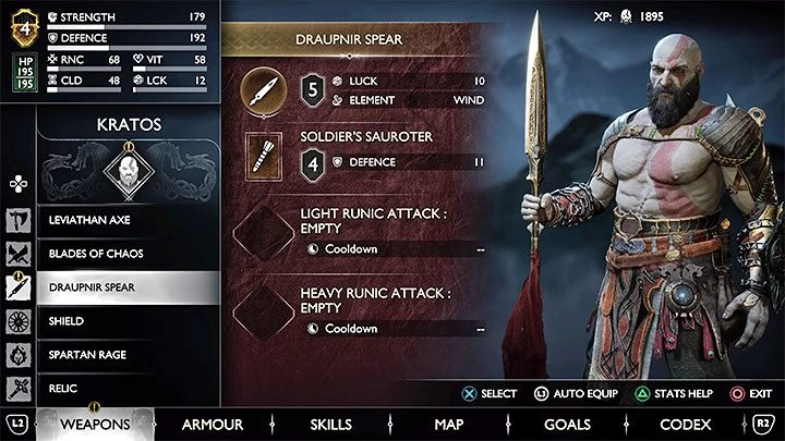 С этого момента вы можете найти копье в вашем инвентаре. Вы можете обновить копье (при посещении магазинов), а также установить Ручки и легкие и тяжелые рунические атаки.