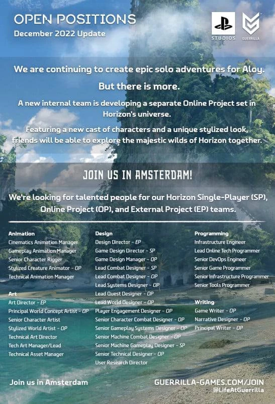 О начале работ стало известно после объявления, где Guerrilla Games приглашает людей в команду для работы над онлайн проектом по Horizon.