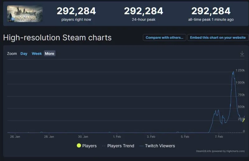 Онлайн Hogwarts Legacy в Steam перевалил за 290 тысяч геймеров, хотя на данный момент играют только те, кто предзаказывал делюкс издание.
