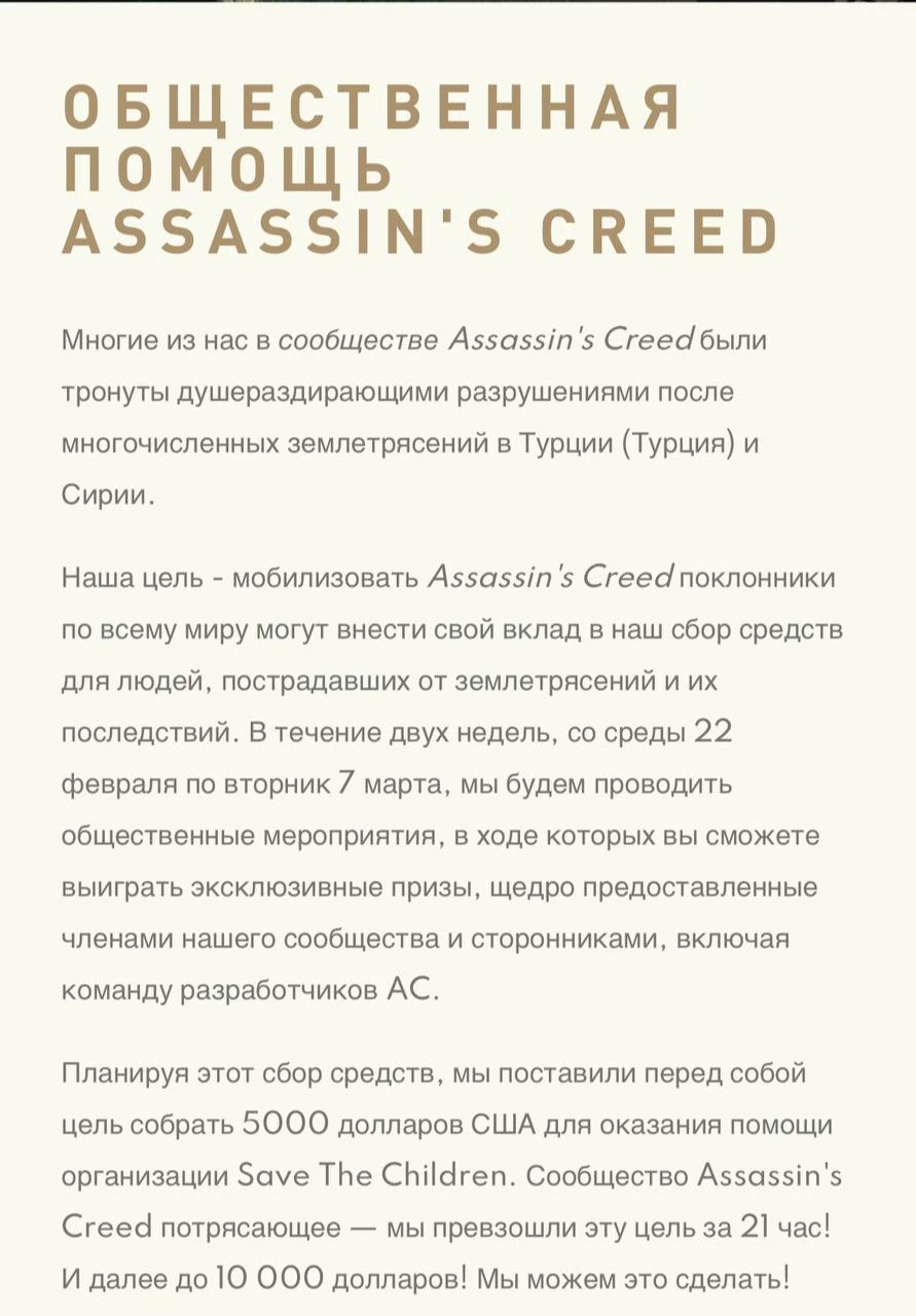 Фанаты серии игр Assassin’s Creed организовали сбор средств для Турции и Сирии, где прошли сильные землетрясения.