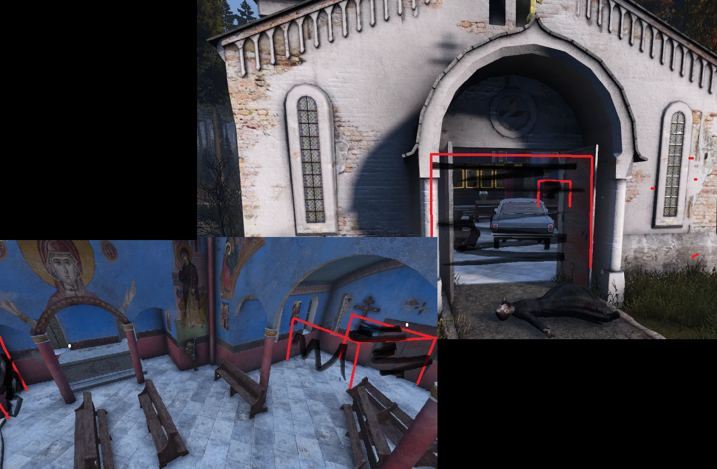 - Окна справа сверху простреливаются, тому лучше машины ставить под правую стенку. Конечно можно преградить путь к окнам, но даже так, если постараться (например досками) то добраться до окон не составит труда