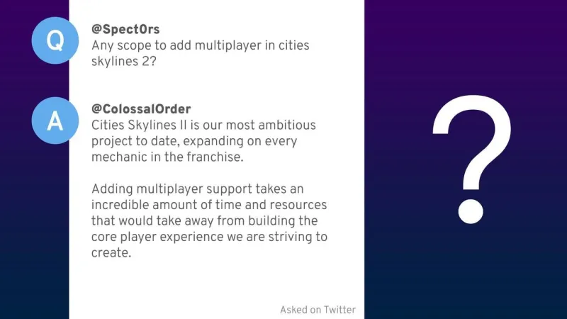 «Cities: Skylines 2 — это наш самый амбициозный проект на сегодняшний день, который расширяет все механики франшизы. Добавление многопользовательской поддержки требует невероятного количества времени и ресурсов, которые будут отняты от создания того игрового опыта, к которому мы стремимся.»