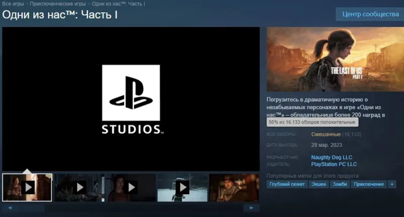 Игроки впервые с релиза подняли рейтинг TLoU в Steam до 50% положительных отзывов!