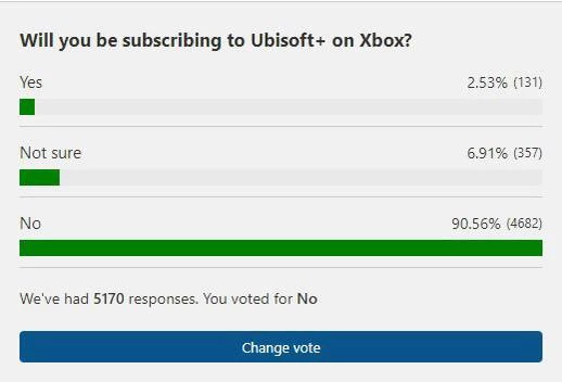 Портал TrueAchievements провел опрос геймеров с Xbox и выяснил, что 90.56% игроков не заинтересовано в покупке Ubisoft+. В опросе приняли участие больше 5100 человек.