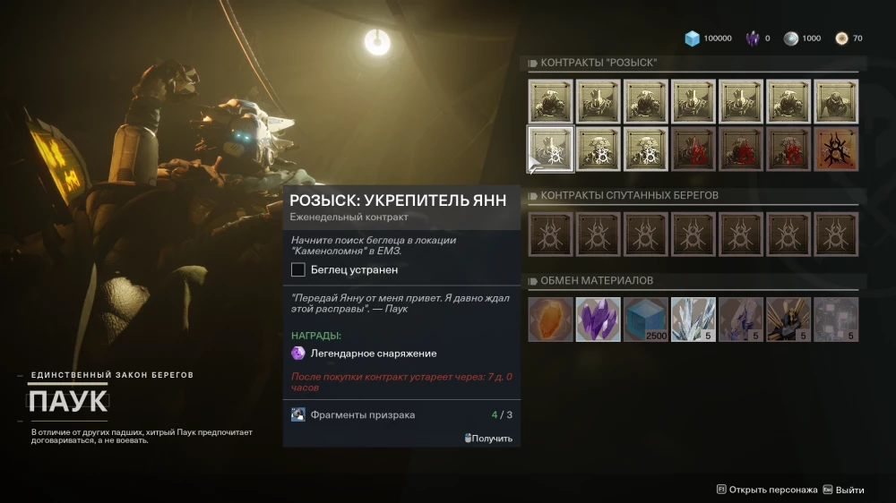 Возьмите за привычку каждый день посещать Паука — дружественного Падшего (Fallen) на Спутанных Берегах. У него не только можно взять ежедневно обновляющиеся контракты с ценными наградами, но и заключить выгодные сделки, обменивая одни ресурсы на другие. У него можно приобрести даже легендарные осколки и ядра абсолют. Это очень хорошее подспорье!
