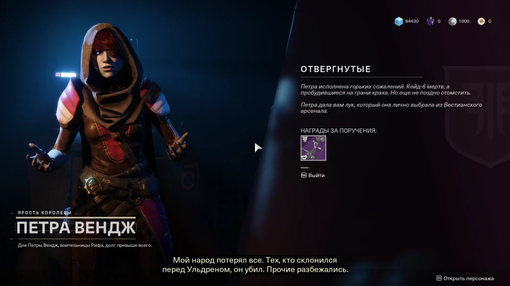И пусть Икора (Ikora) и Завалой (Zavala) вполне довольны свершившейся местью над Ульдреном Совом (Uldren Sov), Петра все же хочет разобраться, что именно произошло с принцем Рифа. Чтобы открыть Город Грез, нужно пробежаться по Затерянным Секторам (Lost Sectors) в той же локации, а затем доложить Петре.