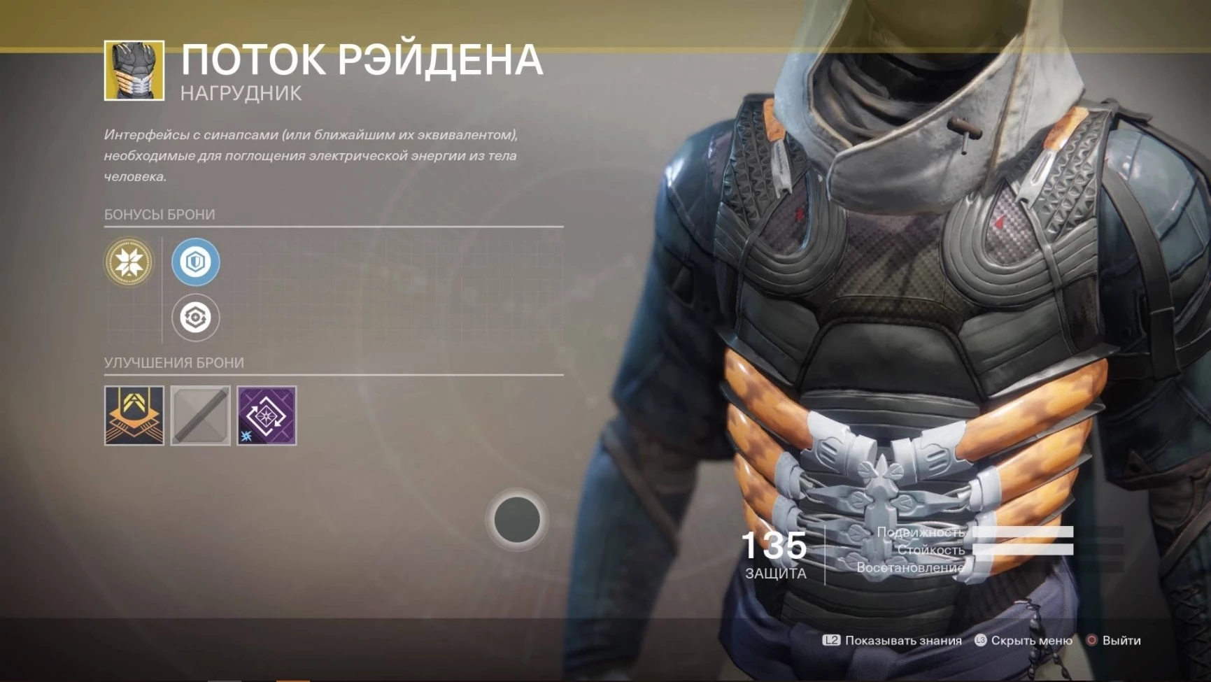 Поток Рэйдена - это экзотическая броня для охотника в Destiny 2. Нагрудник Поток Рэйдена - подходит для Охотников, использующих подкласс Громобежец. Нагрудник имеет два бонуса: быстрые последовательные удары электрическим посохом увеличивают наносимый им урон, продлевая при этом действие эффекта, и классовые способности быстрее перезаряжаются при использовании подкласса Молния.