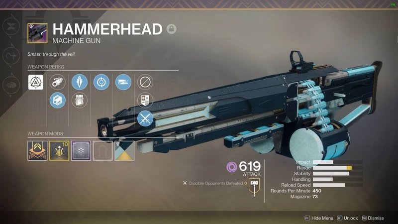 Этот пулемет доступен в качестве награды за вступительный квест Black Armory, и в сочетании с некоторыми перками чрезвычайно полезен в PvP — Feeding Frenzy, Rampage и Surrounded. Оружие с одним из быстрых TTK (временем на убийство). Повысьте диапазон поражения, используя "Гамбит". Также можете добавить перк Mulligan (с определенной вероятностью возвращает боеприпасы в случае промаха).