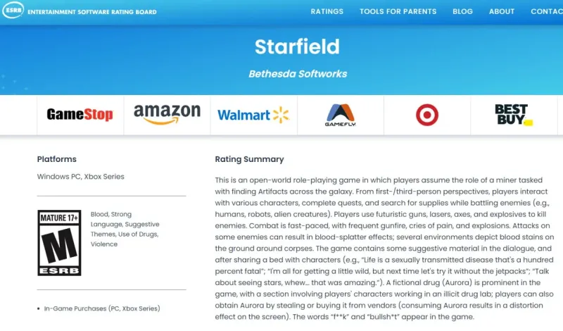 На сайте ESRB, ранее выдавшем игре рейтинг М (17+) появилось несколько интересных сведений, например, подтверждение того, что в Starfield действительно присутствует секс. В описании упоминается несколько фраз, произносимых НПС после того, как они «делят постель» с игровым персонажем. Но, скорее всего, визуальное изображение этого действия отсутствует.