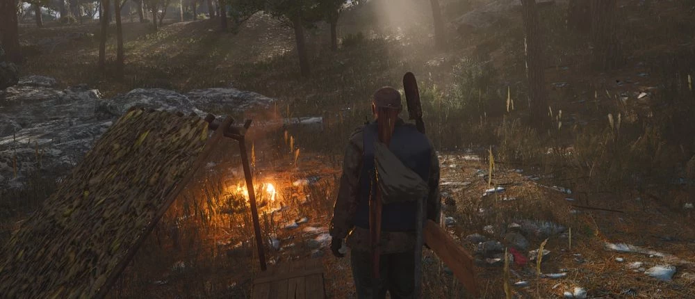 Первым делом нужен нож. Срезаем с кустов 6 маленьких деревянных палок. Крафтим вязанку палок и кладем ее на спину. Размещаем вязанку в выбранном месте. Делаем трут и разводим импровизированный костер. Используем спички, зажигалку или навык, чтобы зажечь огонь.