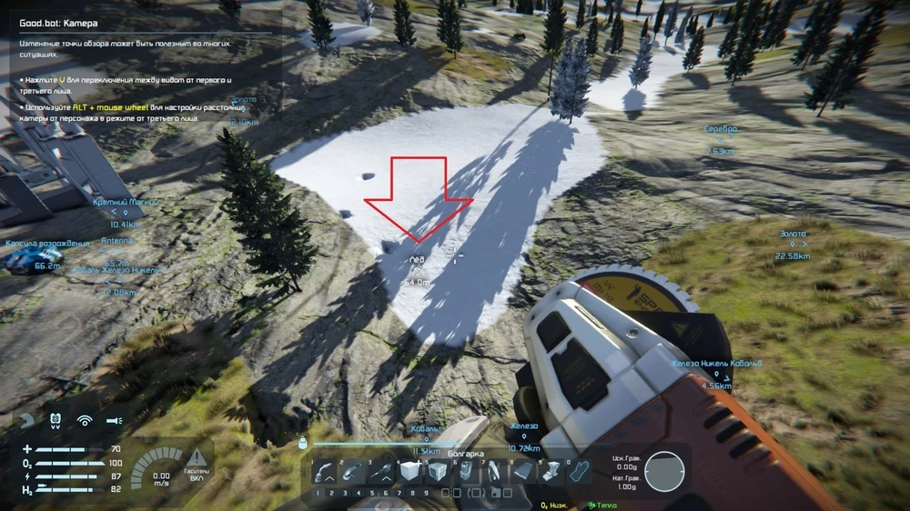 Он показывает направление и расстояние до ресурса. Просто подлетите к земле и присев (С), ройте дыру с помощью ручного бура. Добравшись до ресурса, очистите инвентарь от камня. После сбора не забудьте пометить местонахождение, чтобы вернуться к нему в следующий раз. Для этого нажмите «I», выберите вкладку GPS и нажмите на «новая из текущей позиции». Назовите метку именем ресурса, чтобы не запутаться в будущем.