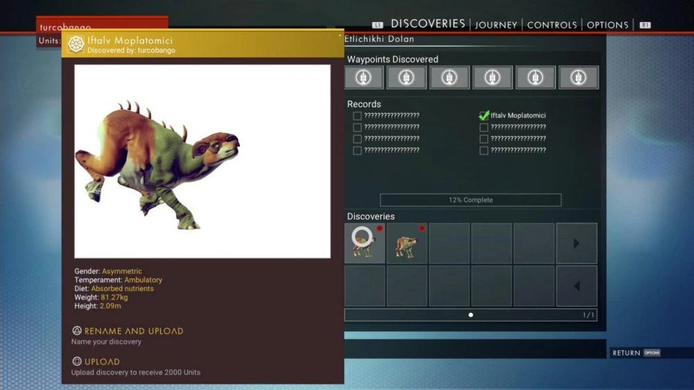 Увидев какое-нибудь очередное нелепое создание, подойдите к нему и проведите анализ с помощью визора. После того, как процесс будет завершен, зверушка появится в меню на вкладке открытий (Discoveries). Это же можно производить и с растениями. После каждого проведенного исследования на ваш счет будут поступать денежные средства в зависимости от редкости и уникальности находки.