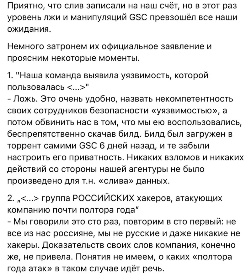 Они утверждают, что никакой кражи не было. Билд выложили на торрент сами сотрудники GSC, просто забыв задать настройки приватности.