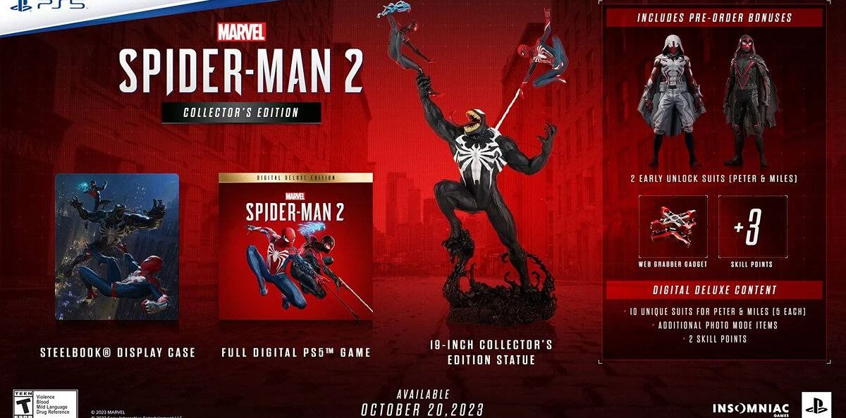 Также нам показали состав Delux-издания (уникальные костюмы) и коллекционного издания (стилбук, статуэтку с Веномом и Паучками (48 см) и цифровые бонусы).