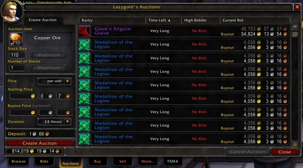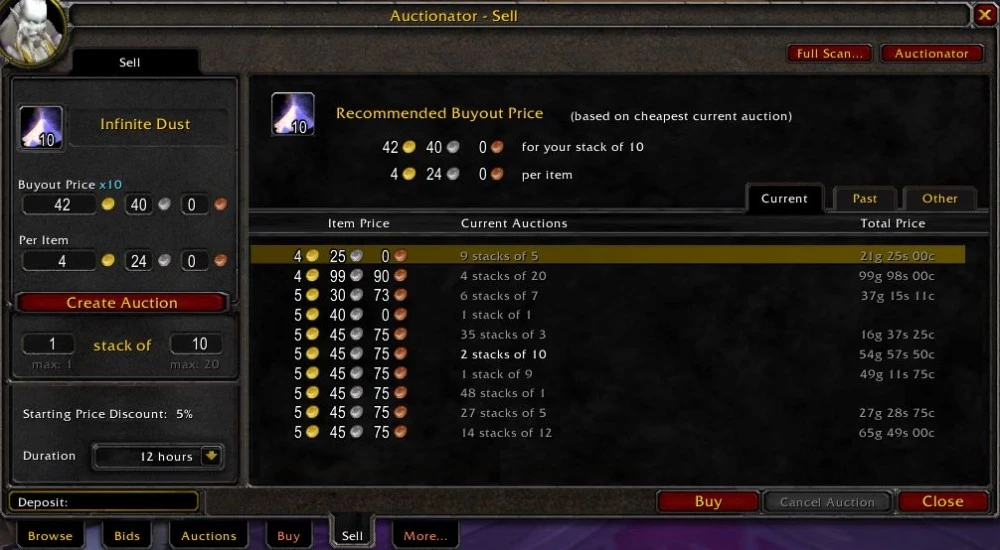 Очень полезным будет расширение Auctionator, которое позволяет вам видеть цены на складываемые в аукционном доме предметы и записывать историю цен.