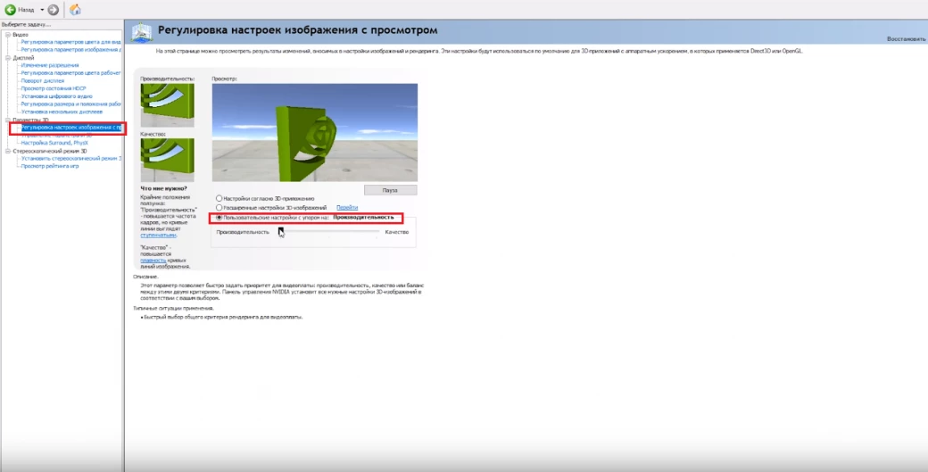 Еще один способ (для обладателей карточек от Nvidia) предполагает шаманство с панелью управления Nvidia. На первом этапе перейдите во вкладку «Регулировка настроек изображения с просмотром» и поставьте галочку на «Пользовательские настройки с упором на производительность». Далее перейдите в «Управление параметрами 3D».