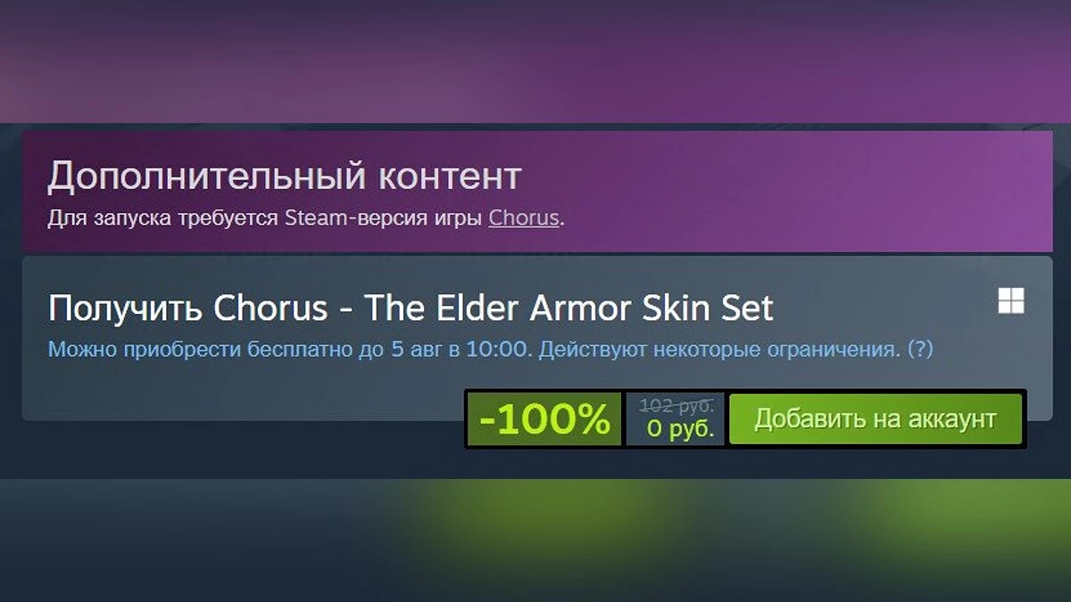 Раздача The Elder Armor Skin Set будет доступна через платформу Steam до 5 августа. Примечательно, что сама игра официально недоступна в российском Steam.