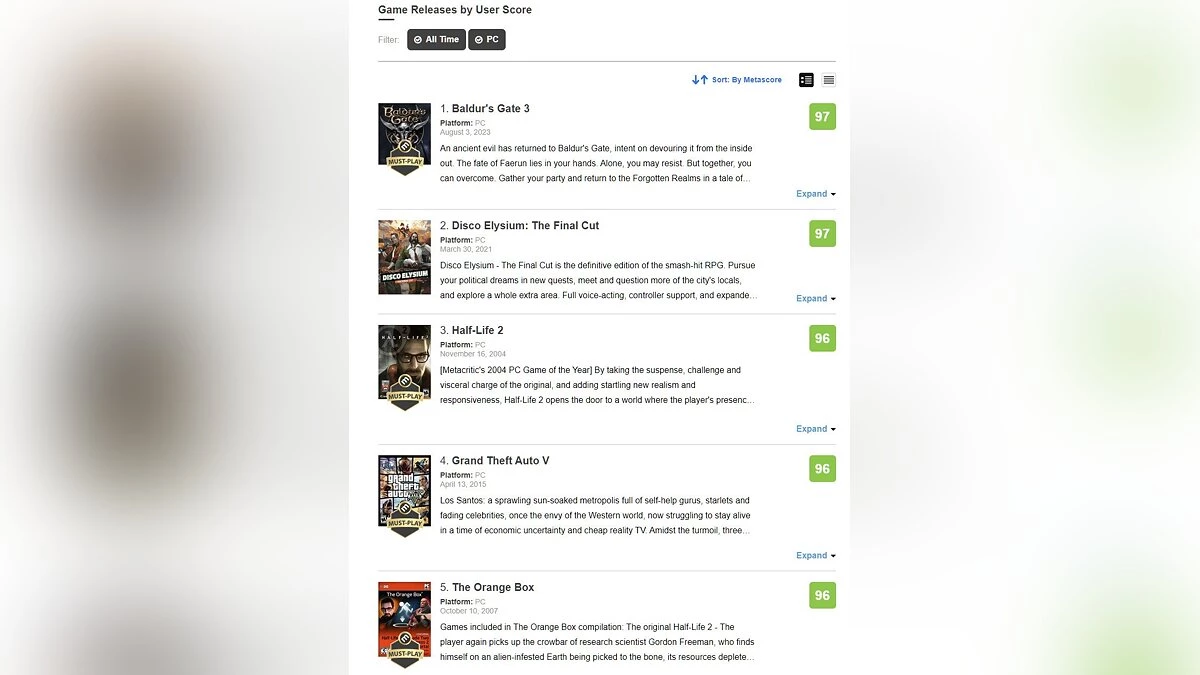 Немного ранее первое место занимала Disco Elysium. Но на данный момент Baldur's Gate 3 и Disco Elysium делят первое место в рейтинге с 97 баллами. За этими играми следуют такие запоминающиеся проекты, как Half-Life 2, GTA 5 и Orange Box.