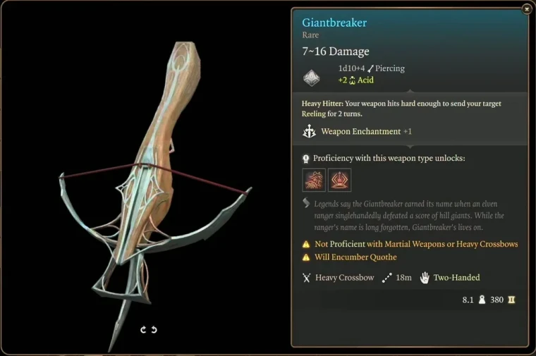 5. Сокрушитель Великанов: Это крайне мощный арбалет с уроном 1d10 может сбить противника с ног и сделать его уязвимым. Вы можете найти его в Убежище Жентарим или купить у торговца Брема, помогая ему найти пропавшее снаряжение.
