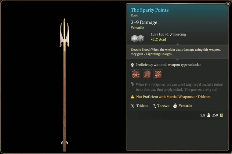 9. Искрящиеся точки: трезубец с проникающим уроном 1d8+2 проникающий. Оружие может использоваться как в одной руке, так и в двух, повышая урон. Каждый удар этим оружием сопровождается дополнительными зарядами молнии. Посох выдается в качестве награды за прохождение задания "Спасение Великого герцога".