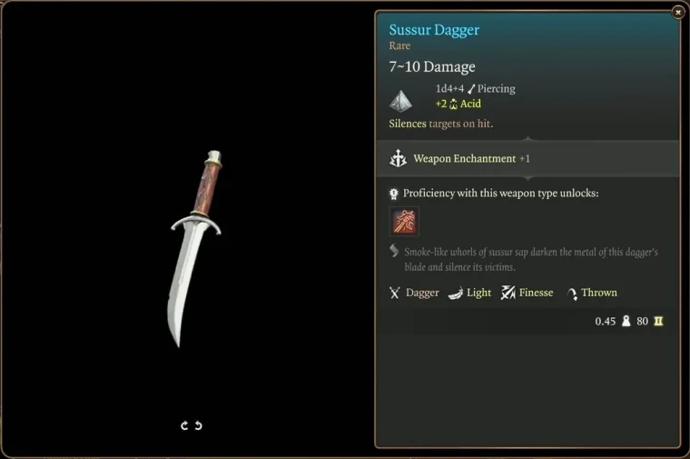 1. Кинжал из суссура: Этот кинжал с уроном 1d4+1 пронзающий отлично подходит для персонажей, которые предпочитают внезапные атаки. При атаке кинжалом цель замолкает на несколько ходов. Вы можете получить этот кинжал в начале игры, если выполните квест "Завершить оружейный шедевр" в Подземье.