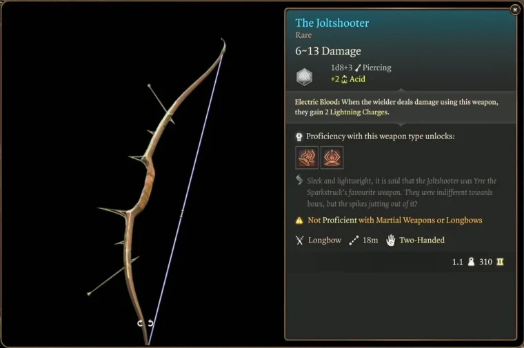 2. Электрошокер: Это превосходный двуручный лук с уроном 1d8+2 проникающий, идеально подходит для героев дальнего боя. При попадании лук выстреливает 2 электрических заряда. Вы можете получить его в качестве награды за прохождение задания "Спасение Великого герцога".