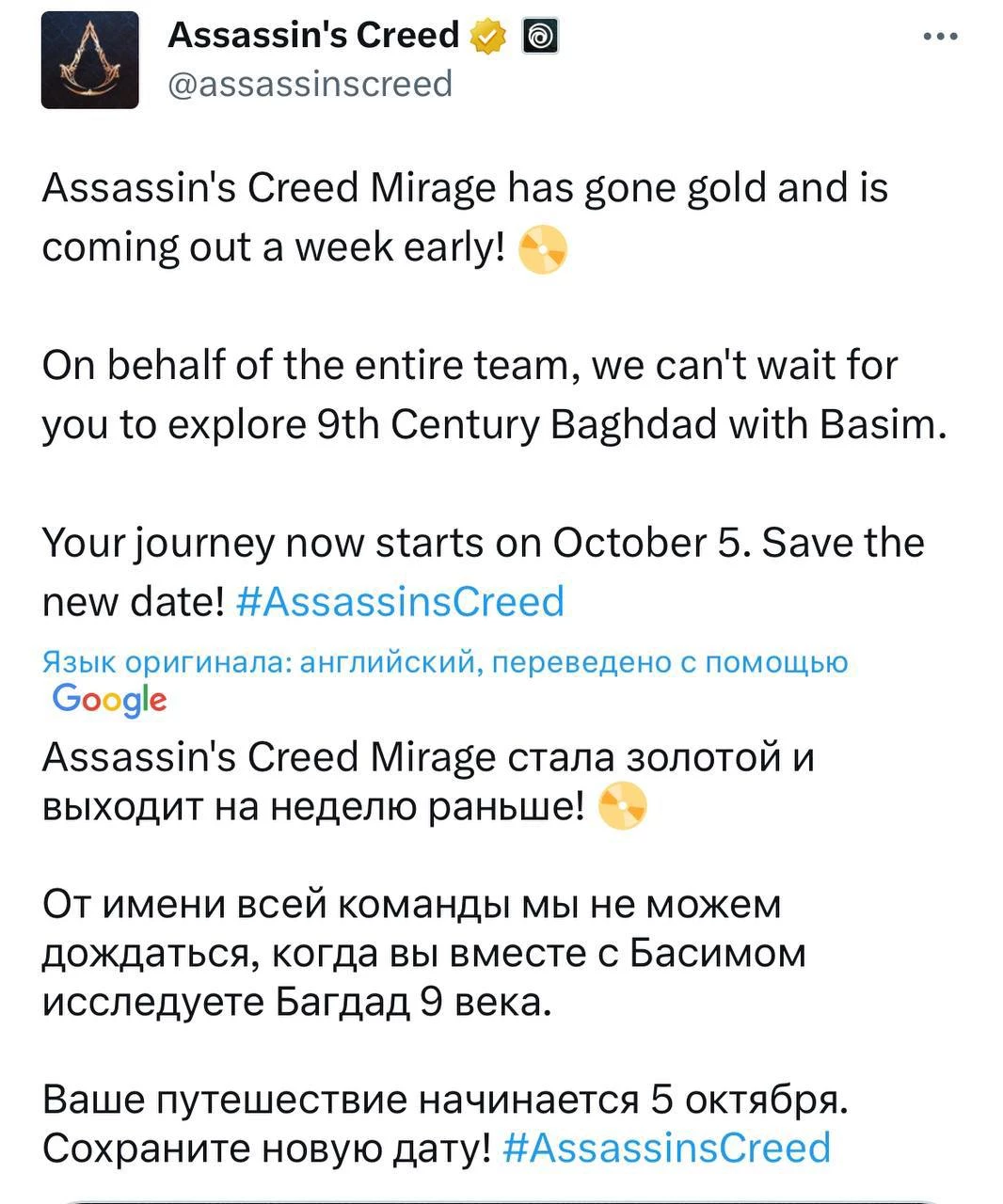 Первоначально Ubisoft планировала выпустить Assassin's Creed Mirage 12 октября, однако все поменялось, и теперь у игры новая дата выхода. Приключения Басима начнутся 5 октября.