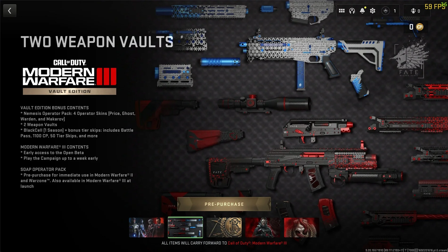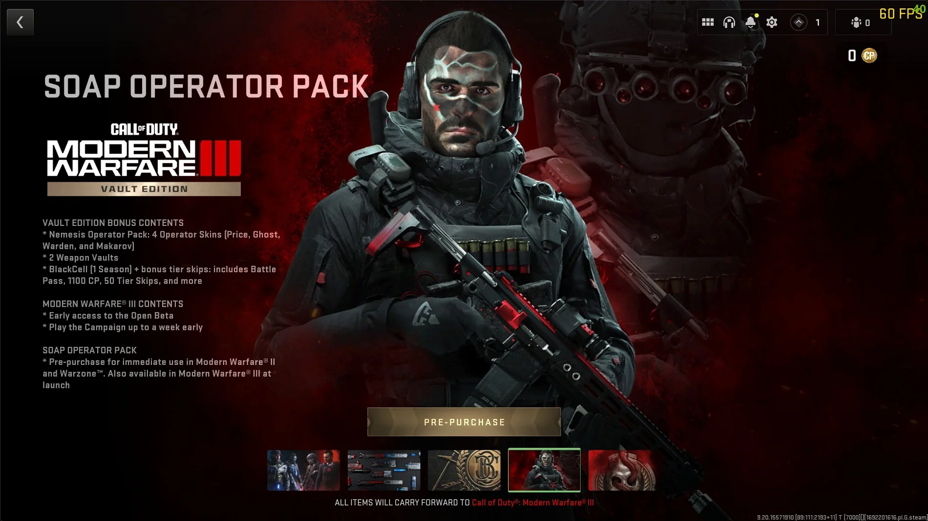 По информации от Тома Хендерсона, предзаказ игры Call of Duty: Modern Warfare 3 предоставит ранний доступ к бета-версии и кампании. Также по информации других инсайдеров, будет доступно издание Vault Edition, которое будет самым дорогим из предложенных и включит в себя ранний доступ к сюжетной кампании, бета-версии игры, два новых оружейных хранилища (Weapon Vaults), новый оперативник для режима Соупа и премиальную версию боевого пропуска BlackCell с возможностью сразу пройти 50 уровней.