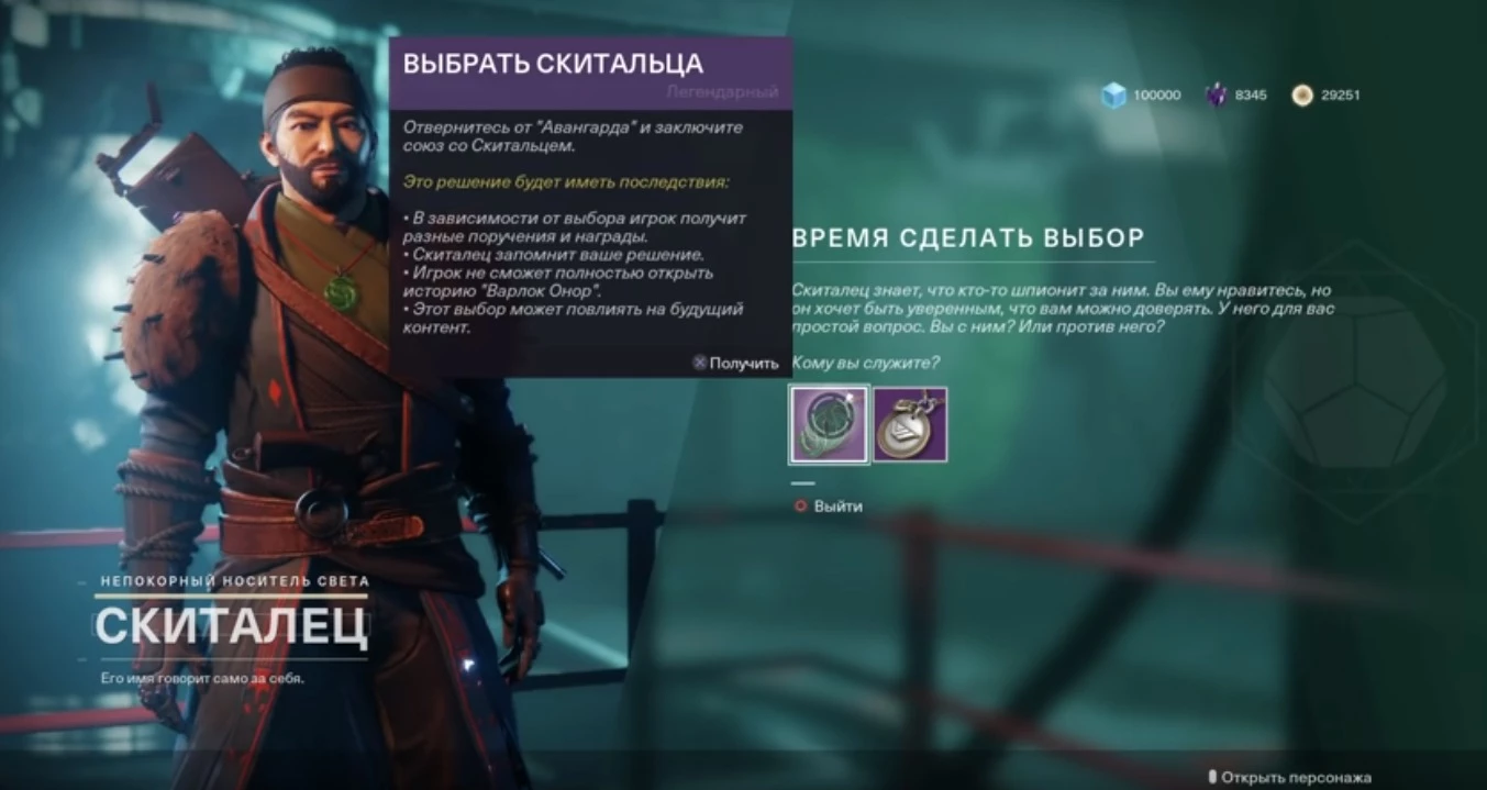 Теперь снова посетите Скитальца, чтобы выбрать сторону. На текущий момент времени ваш выбор в основном будет зависеть только от личных предпочтений и отношения к определенным персонажам, так как неизвестно, что разработчики подготовили для игроков в следующих дополнениях.