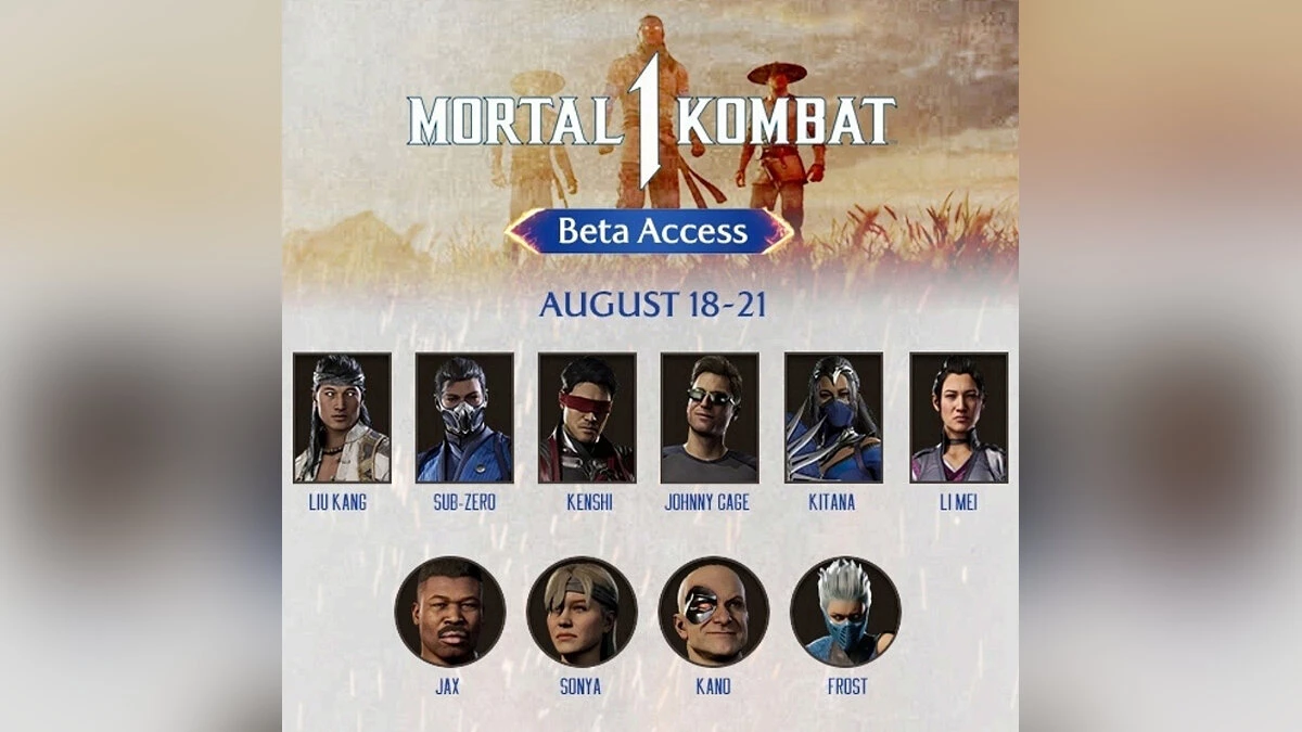 В бете доступно 10 бойцов и 2 арены. («Чайный домик» и «Особняк Джонни Кейджа»). Среди бойцов, которых можно выбрать, есть Лю Кан, Саб-Зиро, Кенши, Китана, Джонни Кейдж, Ли Мей, Кано, Соня, Джакс и Фрост. Последние четыре бойца являются камео-бойцами, то есть они появляются в игре в качестве гостевых персонажей.