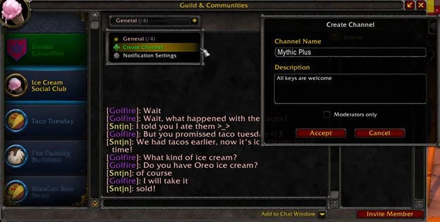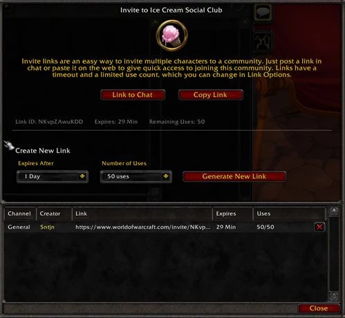 Вступить в сообщество можно и перейдя по прямой ссылке в чате. Сообщества в World of Warcraft однофракционные и привязаны к конкретному персонажу, так что вы должны отдельно присоединиться каждым персонажем, если хотите всегда быть на связи.