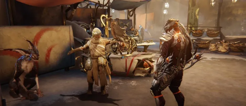 Если у вас нет Додзё для проведения сделки, выходом станет Базар Мэру. Эта станция в данный момент находится на орбите Марса. У вас будет выбор комнат. Выбирайте комнату, вплотную заполненную игроками. Базар Мэру — уникальное место, напоминающее блошиный рынок, где игроки могут как тусить, так и заниматься трейдингом лично. После респавна на рынке, в лобби вы найдете саму Мэру и других игроков, которые будут готовы торговаться. По мере того, как вы будете ходить по закоулкам этого места, вам будут встречаться варфреймы с поднятыми руками. Это значит, что у них есть вещи на продажу. Список вещей будет расположен прямо над головой каждого варфрейма. Если захотите приобрести один из этих предметов, то просто скажите игроку.