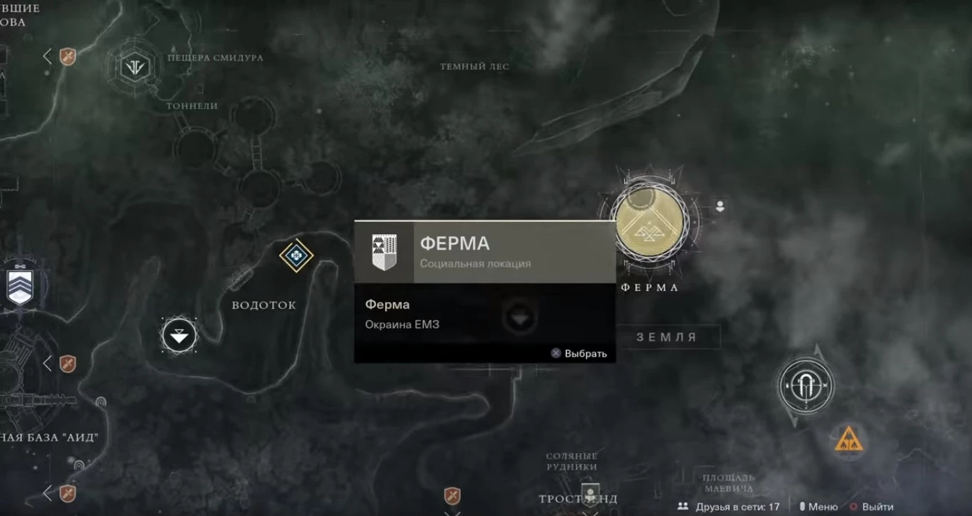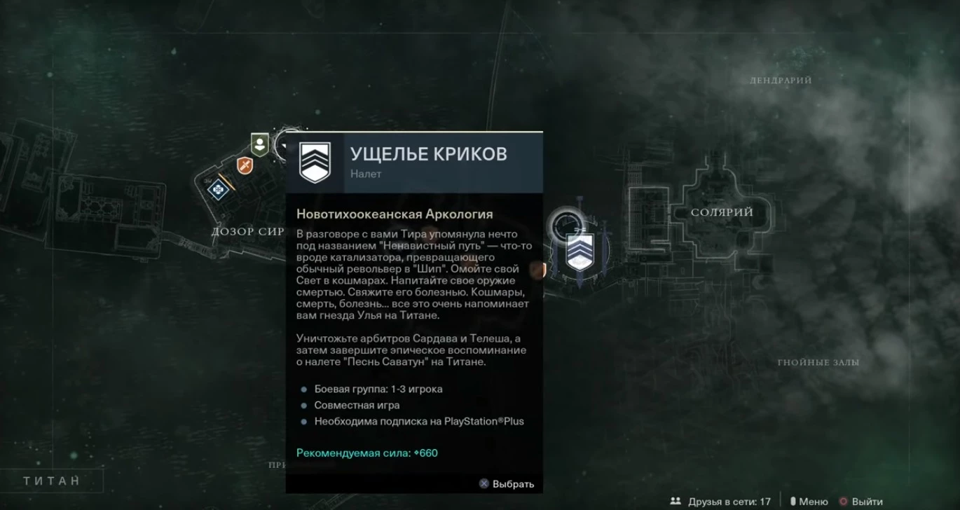 Теперь направляйтесь в Ферму и поболтайте с Тирой Карн. Попасть в нее можно через «Консоль Навигации» (смотрите скриншот ниже) в ЕМЗ. Поговорив с нужным персонажем, отправляйтесь на Титан и возьмитесь за выполнение налета «Ущелье Криков». Уровень силы должен быть выше 660.