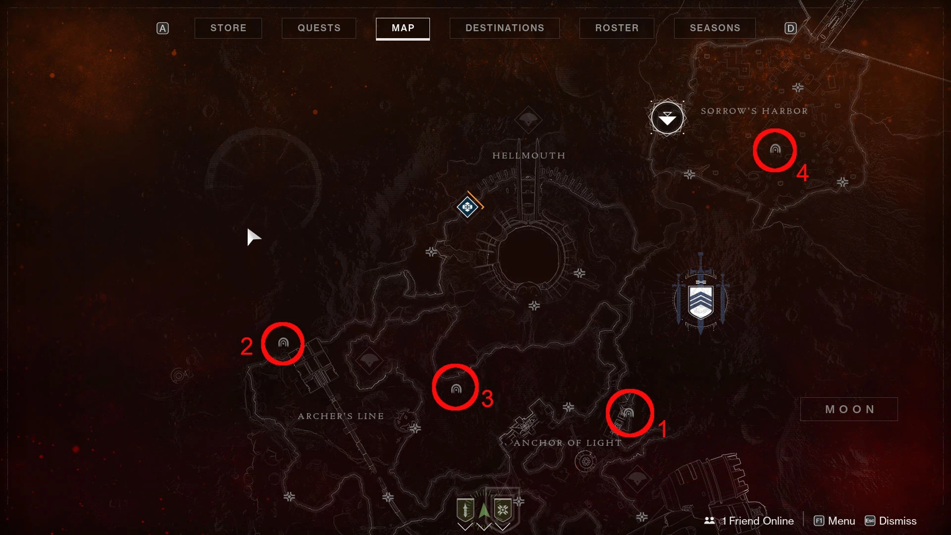 Прежде всего, вам нужно закончить основную сюжетную линию расширения. После этого поговорите с Эрис Морн, и она даст вам задание «Память о Сай Мота». Оно требует выполнения еженедельного контракта персонажа – для этого необходимо завершить 3 затерянных сектора на Луне (их расположение показано на скриншоте ниже).
