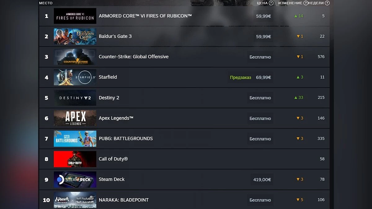 Также стоит отметить, что Starfield, которая планируется к выходу 6 сентября этого года, поднялась на три позиции в топе самых продаваемых игр. Предстоящий проект уже вызывает значительный интерес у игроков.