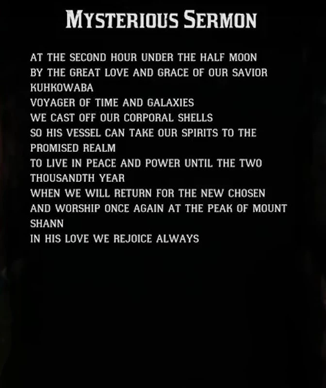 «Во второй час полумесяца, огненные великой любовью и благодатью нашего спасителя, Куковабы, путешественника по временам и галактикам. Мы сбрасываем с себя человеческие оболочки, чтобы его судно забрало наши души в царство обещанное, чтобы жить там в мире и могуществе до двухтысячного года, когда мы вернемся за новыми избранными и вновь вознесется молитва на вершине горы Шанн. Возрадуемся его любви»