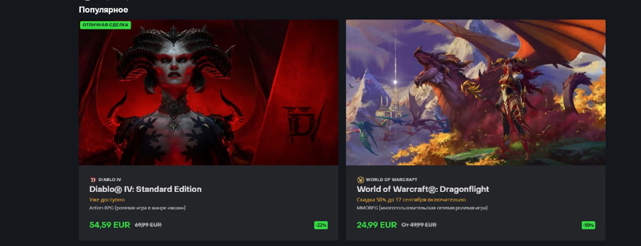 - World of Warcraft: Dragonflight - 24,99 евро (со скидкой 50% до 17 сентября).