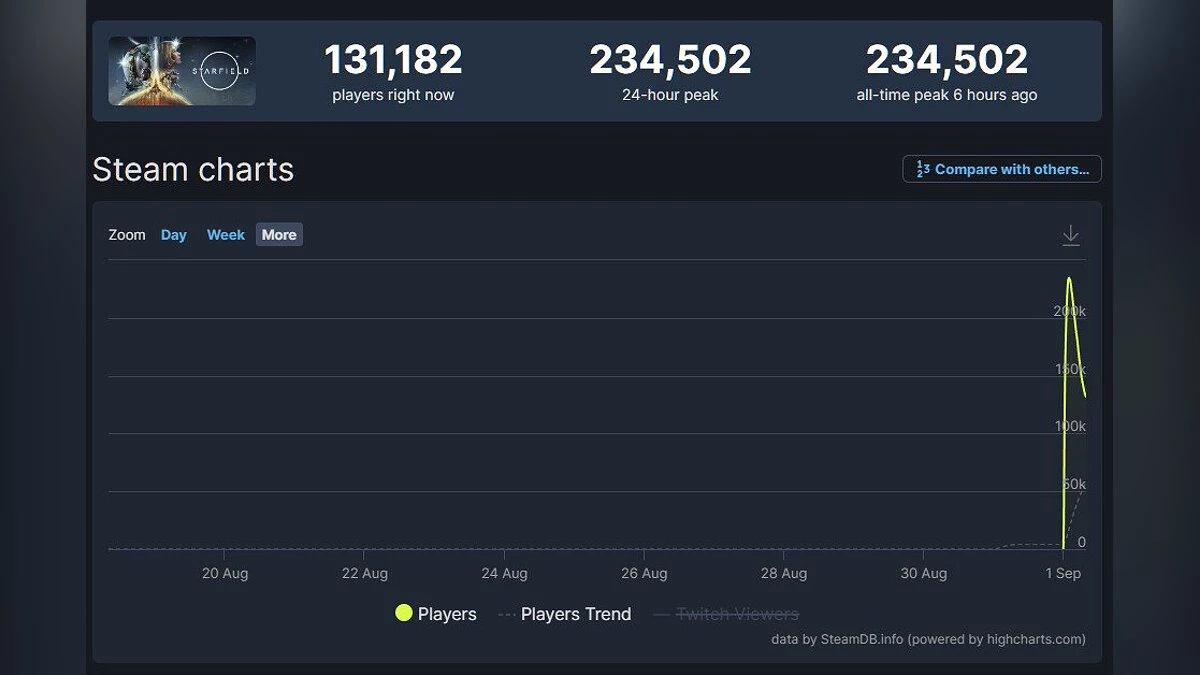 Недавний запуск игры Starfield был ошеломительным успехом, собрав огромное количество игроков и привлекая массу внимания на платформе Steam и в стриминговом сервисе Twitch. Согласно данным сервиса SteamDB, пиковый онлайн игры достиг 234 тысяч игроков, что является впечатляющей цифрой. И, учитывая наступающие выходные, ожидается, что число игроков еще вырастет.
